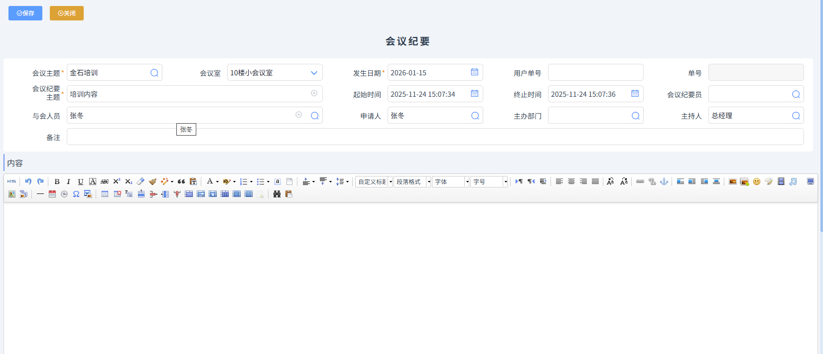會議紀要員根據會議內容,記錄會議紀要,整理完畢后,做會議紀要登記,如下圖所示,內容部分,可以復制黏貼整理好的內容,還可以添加圖片,調整字體、段落格式等,