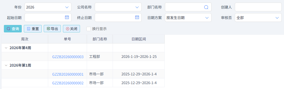 工作周報一覽可根據年份、公司名稱、部門名稱、創建人和日期查詢對應周報,如下圖所示: