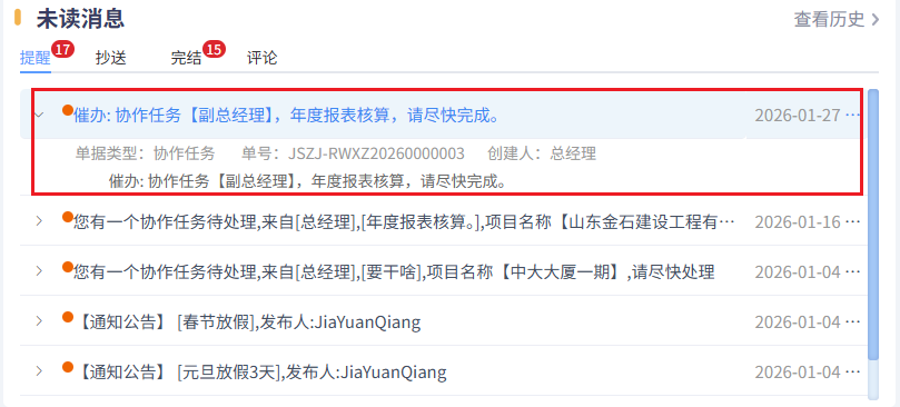 保存后,任務發起人會收到任務完成的消息提醒。如下圖所示: