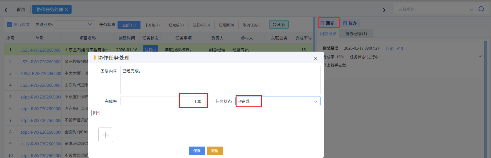 在彈出的任務處理界面,輸入完成率(當前任務的進度)、回復消息并更新任務狀態,如下圖所示: