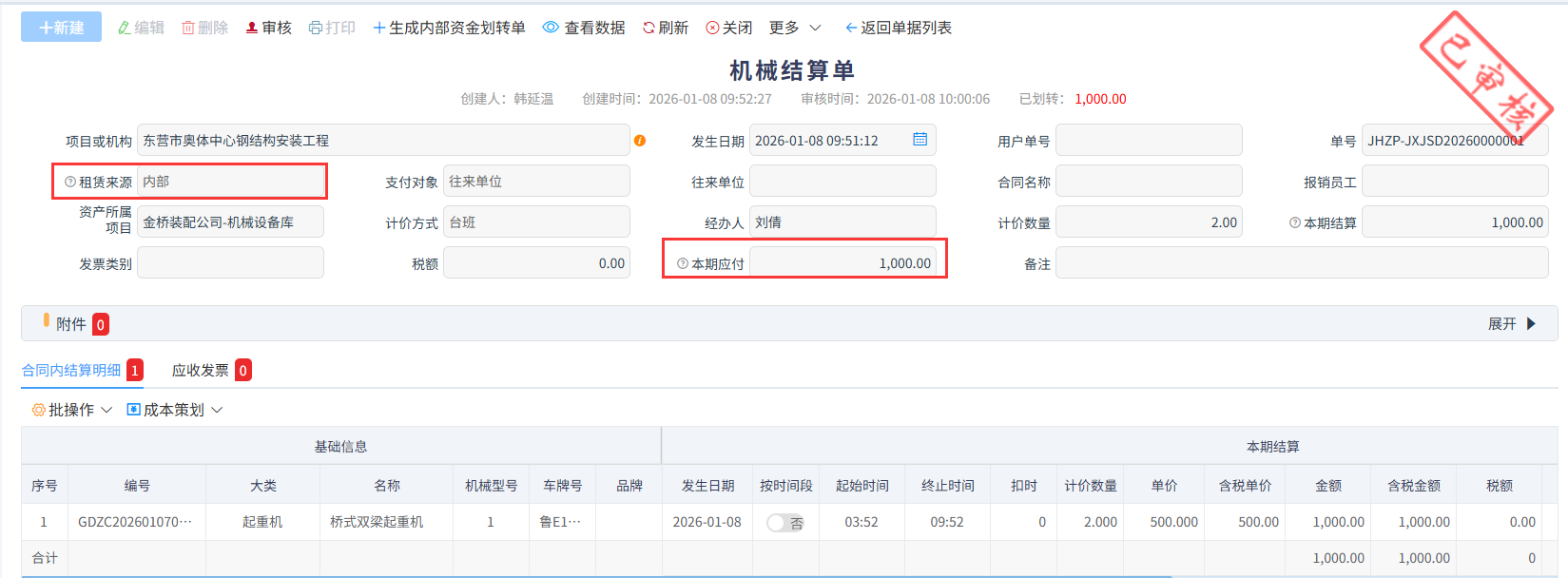 大部分內部業務是先有內部結算(如【機械結算單】、【周轉材結算單】、【費用分攤】、【材料調撥】、【工資分攤】、【項目補繳稅金】、【內部借款】、【內部還款】、【內部利息】)再以內部結算進行企業內部資金劃轉,每筆結算和劃轉必須是相同一個“營業執照”內不同機構或項目之間的內部往來,可規范內部資金流轉,確保資金調撥有跡可循、審批合規便于財務部門統一核算、對賬和資金管控。