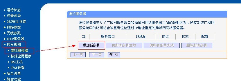 點左側(cè)菜單中轉(zhuǎn)發(fā)規(guī)則,在打開的菜單中點虛擬服務(wù)器,然后在右側(cè)虛擬服務(wù)器框中點添加條目,