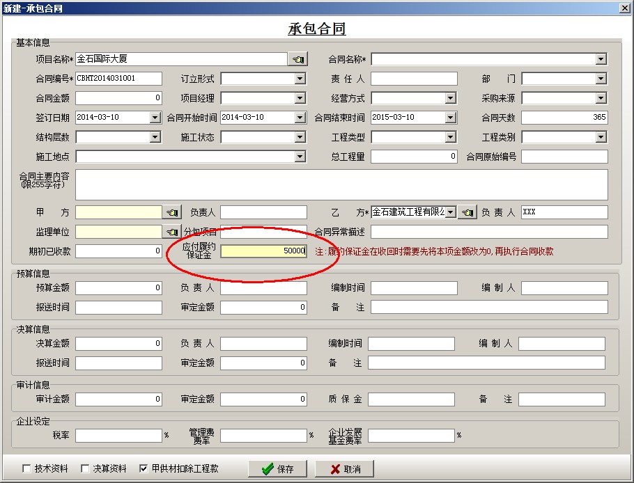(2)再到【承包合同】中建立對應的合同,并錄入應交納的“應付履約保證金”。