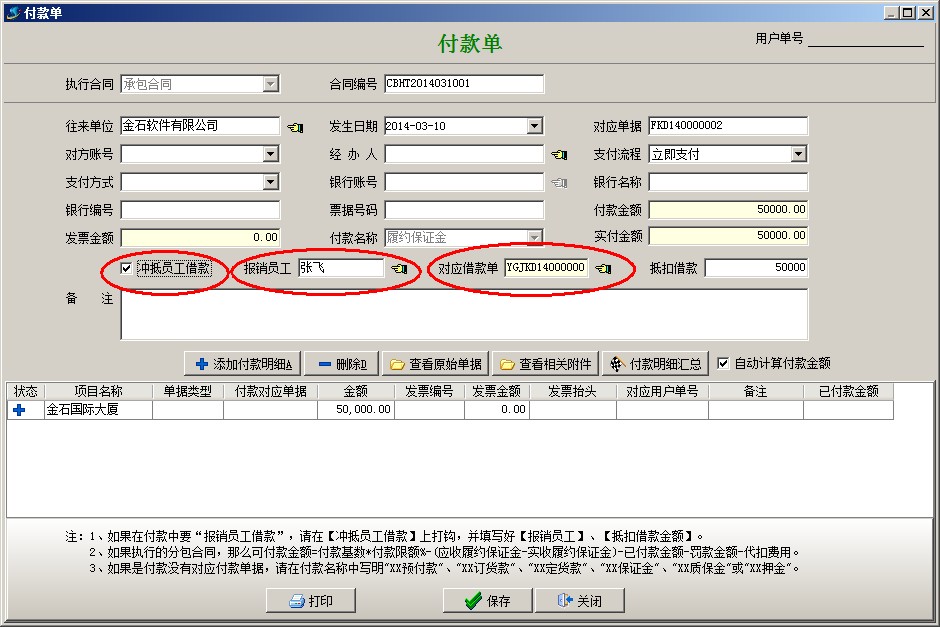 付款單保存之后,投標時的保證金就自動轉為項目的履約保證金,并且抵扣了業務員的借款。